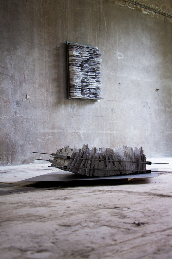 Pappmaché (zwölf verschiedene Zusammensetzungen), Gewindestangen, Vierkantrohr, Metallplatte