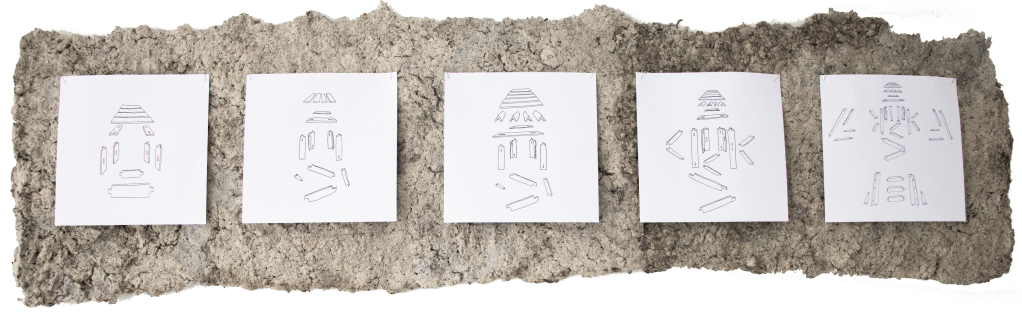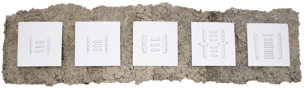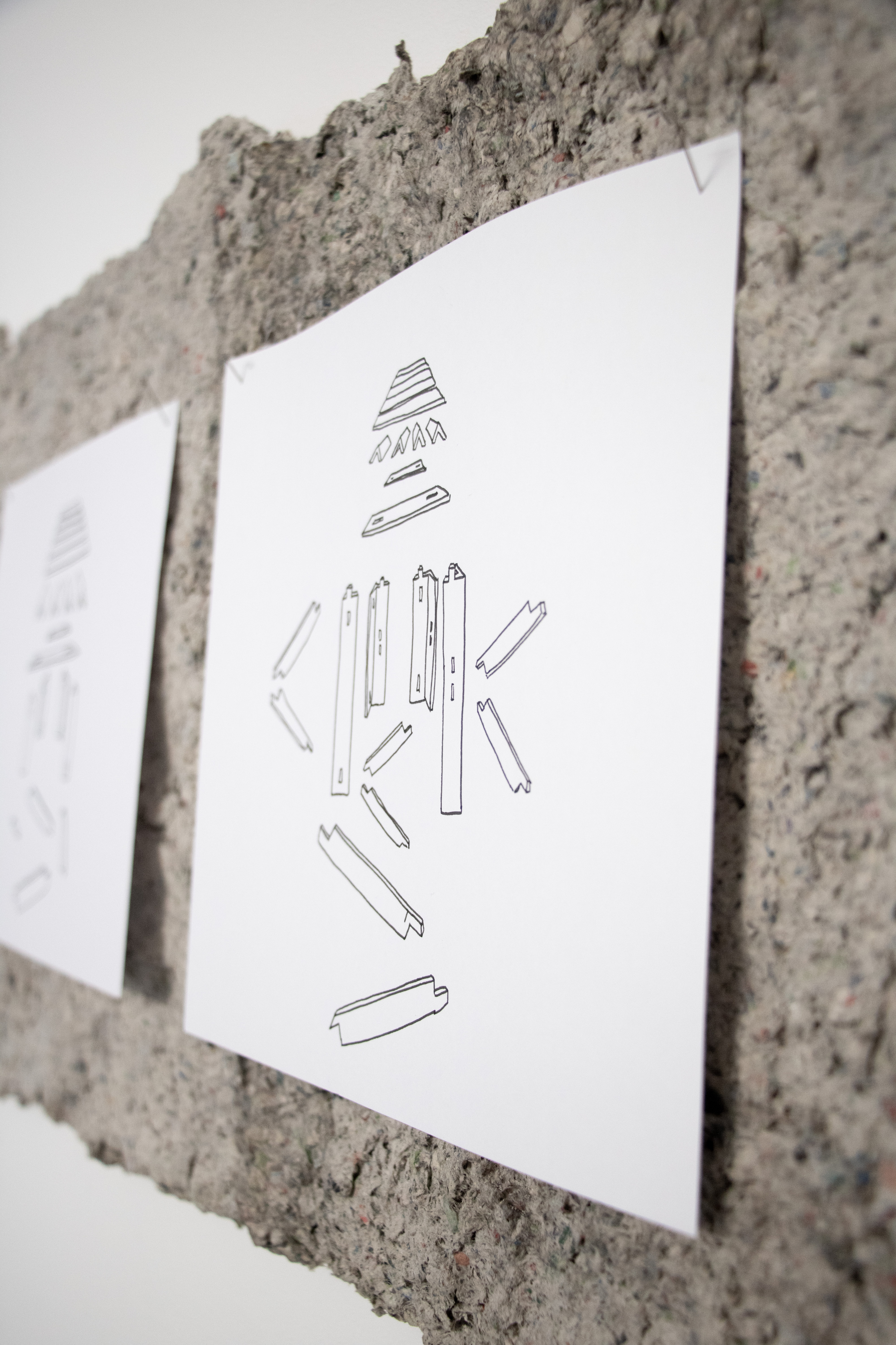 Im Zuge meiner künstlerischen Forschung an Pappmaché und dessen bildhauerischen und konstruktiven Fähigkeiten baue ich seit einiger Zeit Testobjekte, anhand derer ich verschiedene Bauweisen ausprobiere und auf ihre Stabilität teste. Diese Zeichnungen entstehen im allerersten Schritt jeder neuen Planung dieser Testobjekte. Die Explosionszeichnungen dienen der Visualisierung und der Ausarbeitung des Stecksystems der Pappmaché-Module. Von links nach rechts gelesen erzählen sie die Forschungsgeschichte der Objektreihen „Leitern“ und „Hocker“.