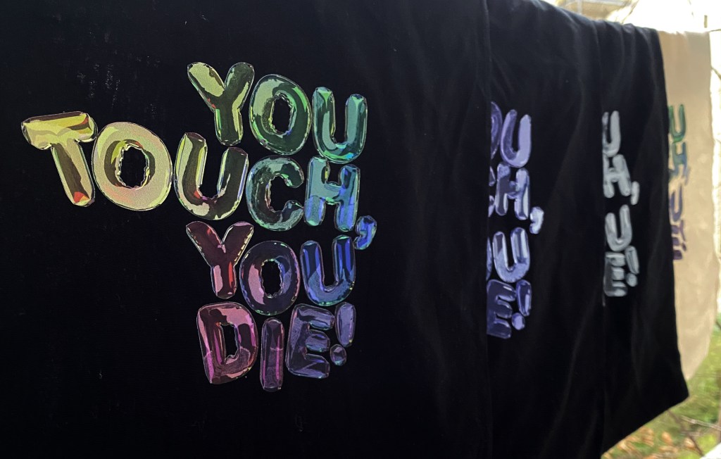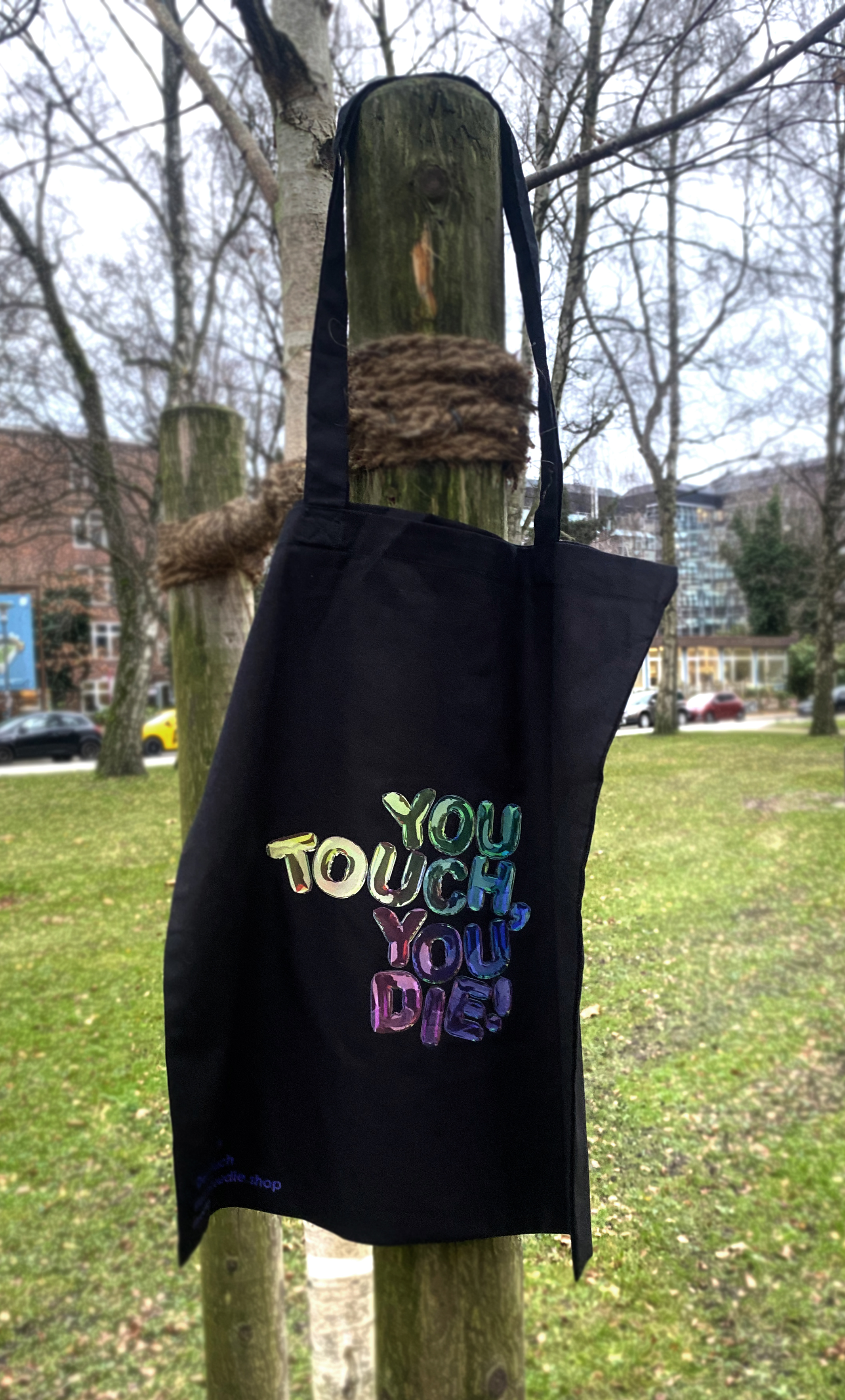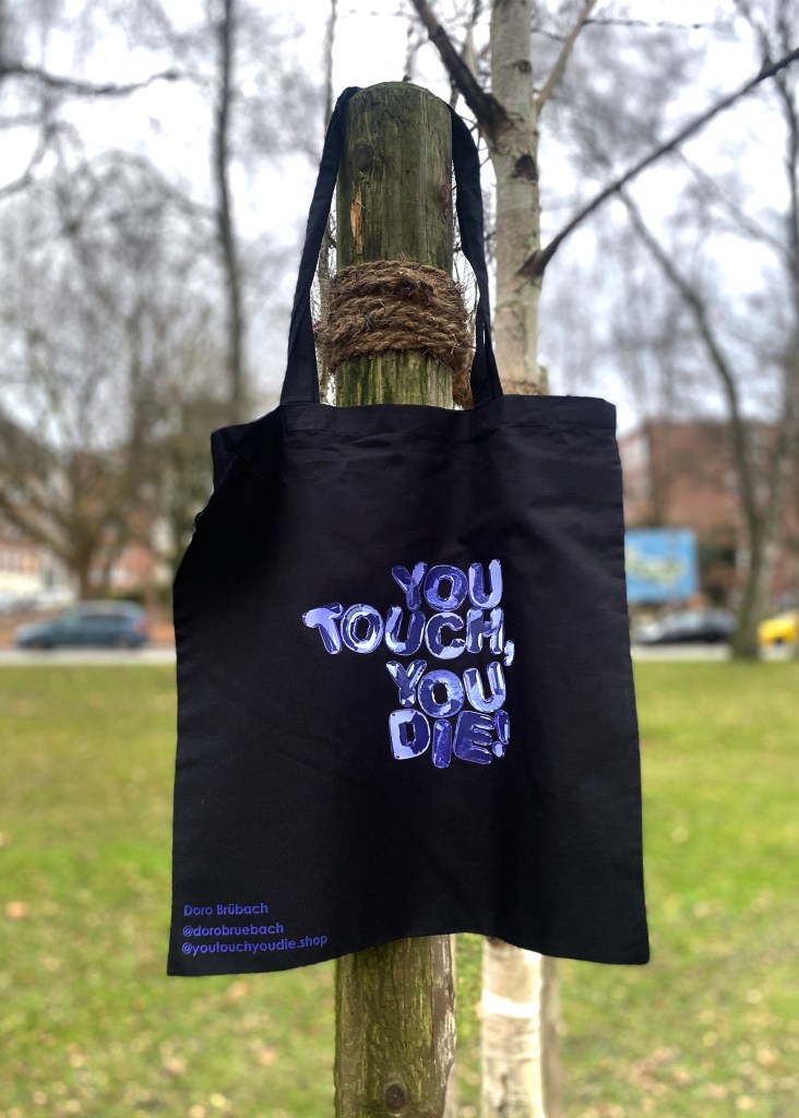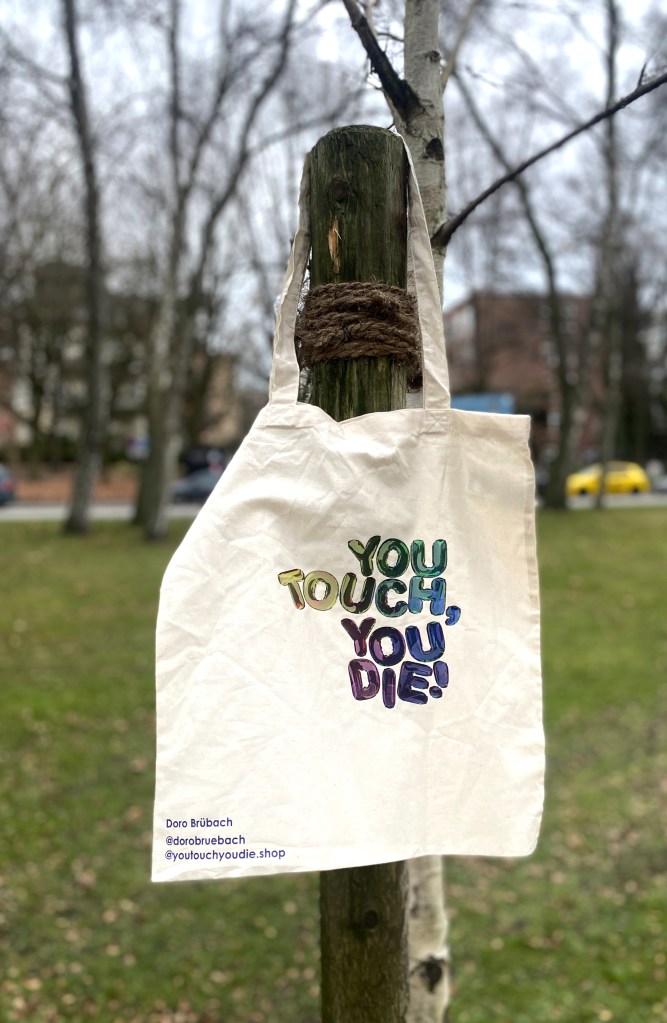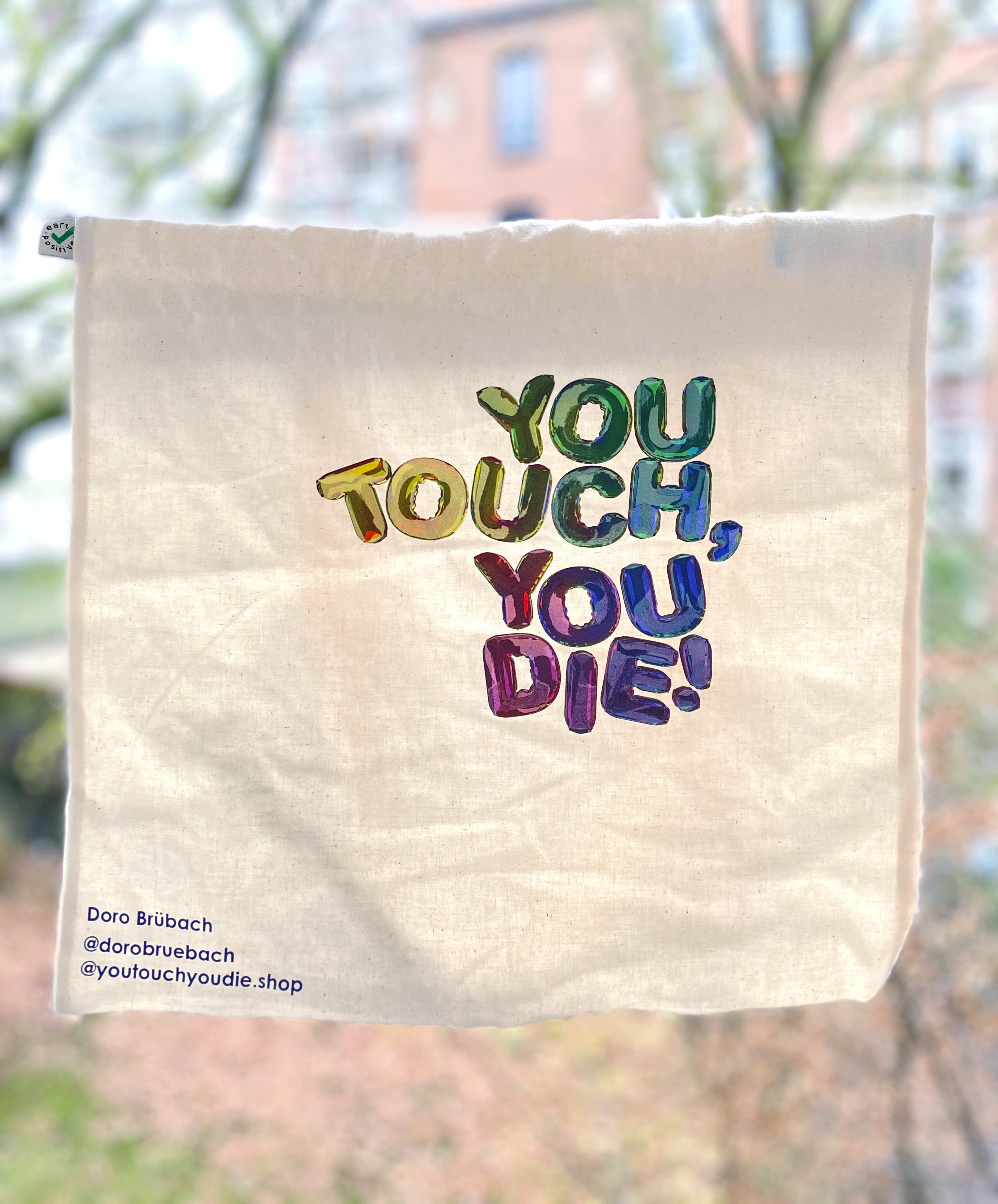 Vegane, öko, fairtrade Beutel aus Bio-Baumwolle. Bunter, einseitiger Druck mit digitalem Druckverfahren, handbedruckt von No Collar Siebdruck in Kiel.